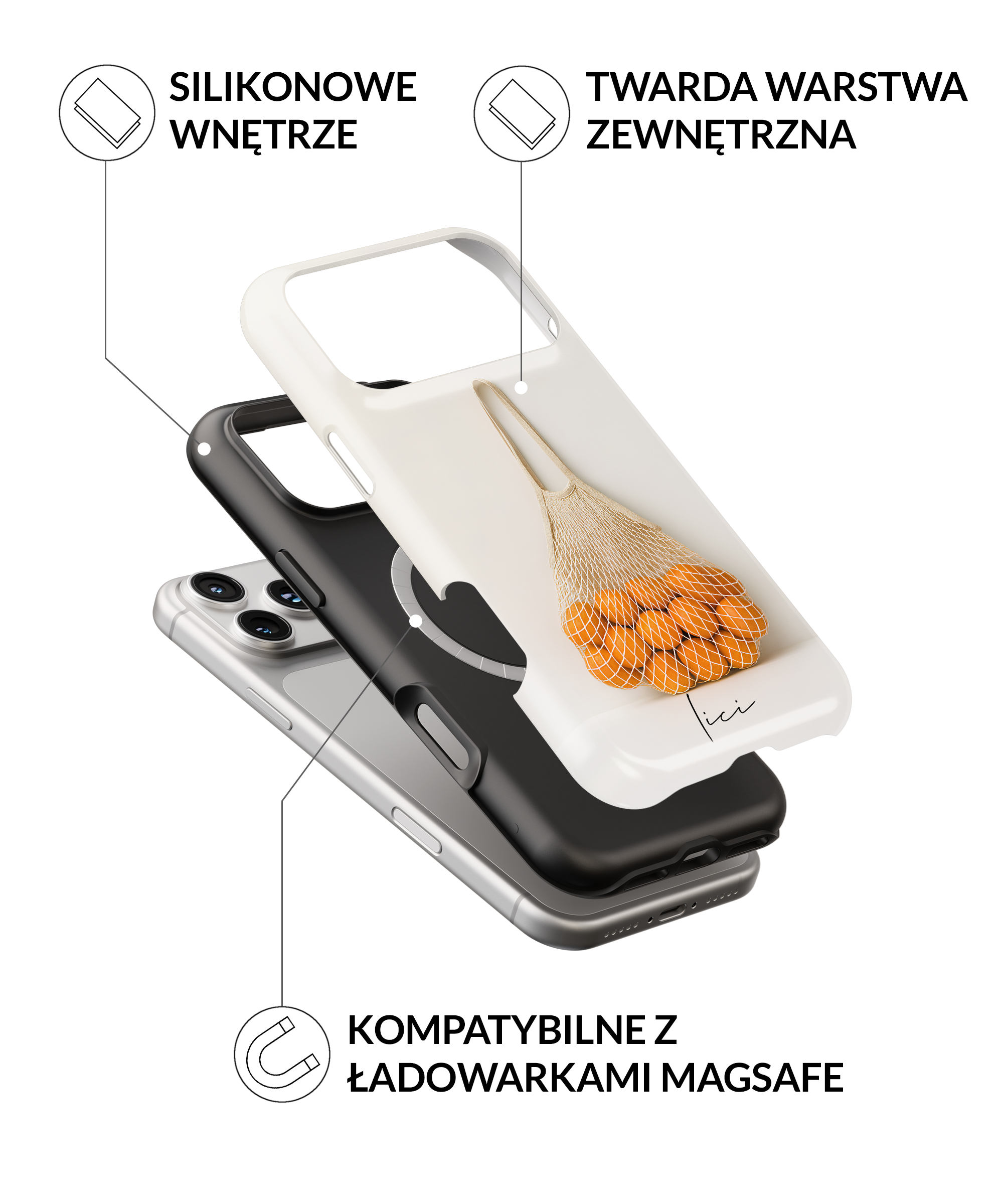Dwuwarstwowa konstrukcja – elastyczny TPU i twardy poliwęglan – gwarantuje skuteczną ochronę przed upadkami, bez kompromisów w wyglądzie.